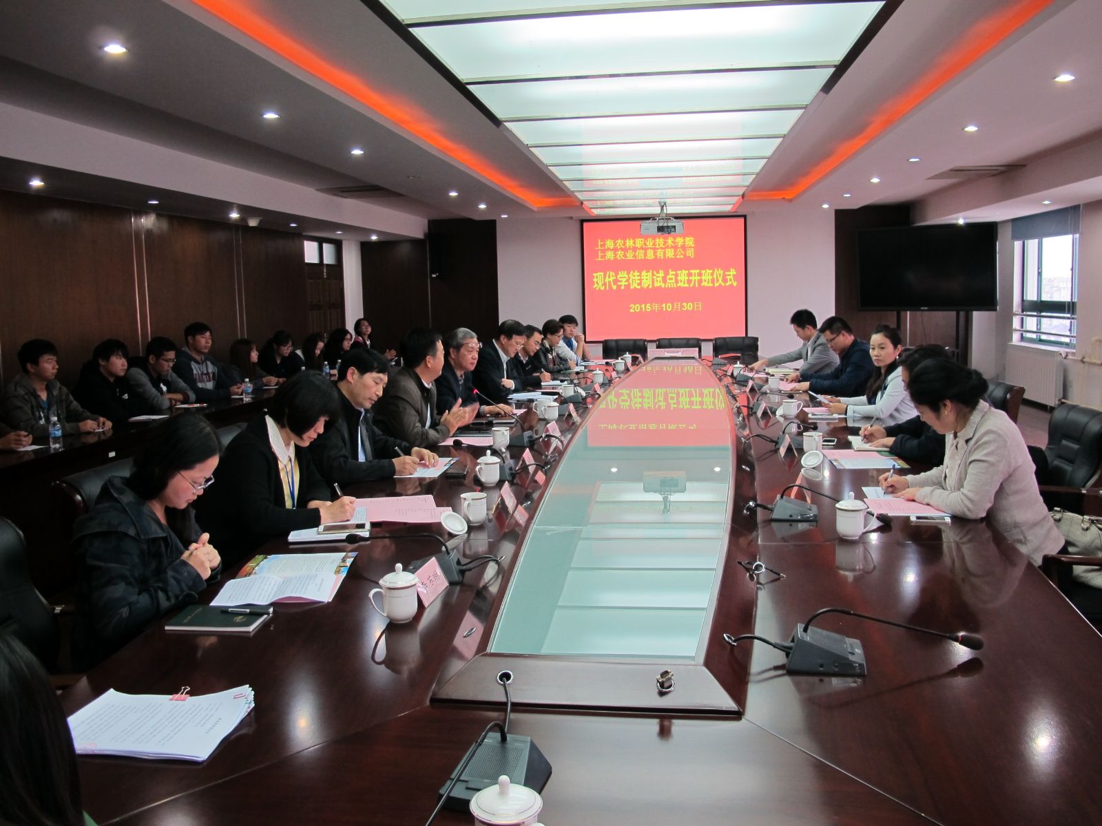 10月30日下午,学院和上海农业信息有限公司共同组建的现代学徒制试点班开班仪式在综合教学楼1101室举行。上海市农业委员会信息中心副主任张向飞、上海农业信息有限公司董事长占锦川、学院党委书记吴乃山,院长魏华出席,院办、教务处、农业信息工程系、校企合作办公室负责人以及“农信班”全体学生参加会议。会议由副院长谢锦平主持。