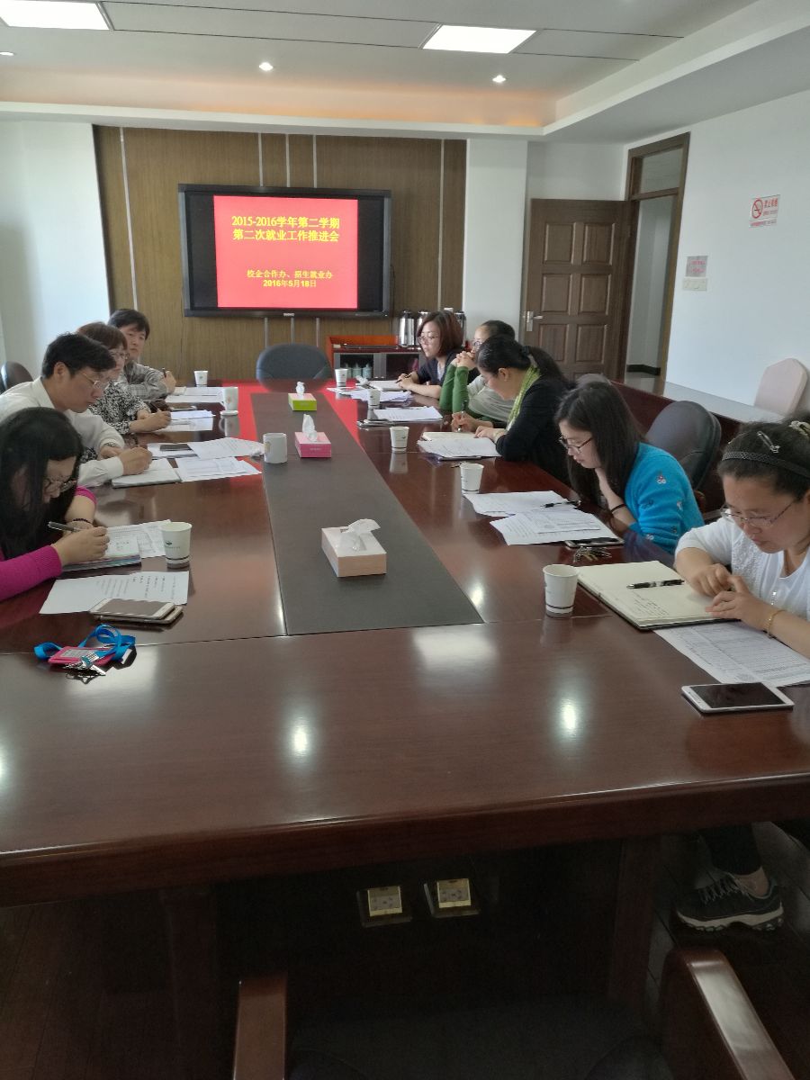 5月18日上午,学院在综合教学楼会议室召开了2015-2016学年第二学期第二次就业工作推进会,院党委副书记、副院长俞锦禄、各系部书记及校企合作办(招生就业办)相关人员参加了本次会议,会议由校企合作办主任辛雅芬主持。
