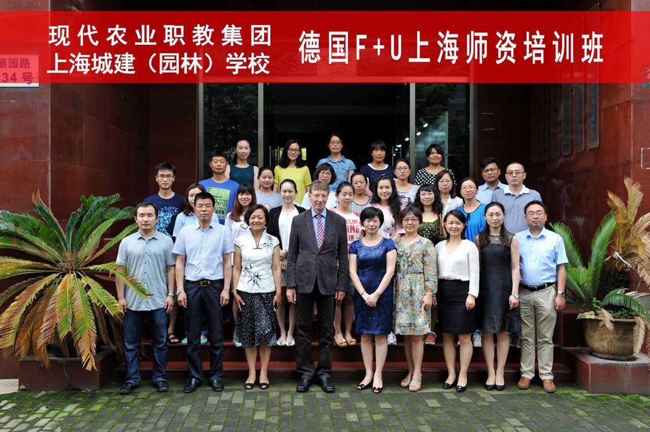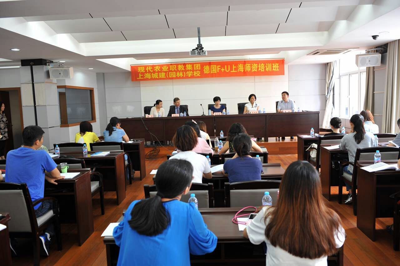 2016年7月4日上午9点,经过将近一年的筹备,由现代农业职教集团主办、上海市城市建设工程学校(上海市园林学校)承办、德国F+U萨克森培训进修学院负责实施培训的“德国F+U上海师资培训班”在我校正式开班。上海市教委教育技术装备中心副主任周齐佩女士、德国F+U萨克森培训进修学院教务校长Eilzer先生、上海市城市建设工程学校(上海市园林学校)朱迎迎校长、曹枫副校长出席了开学典礼。