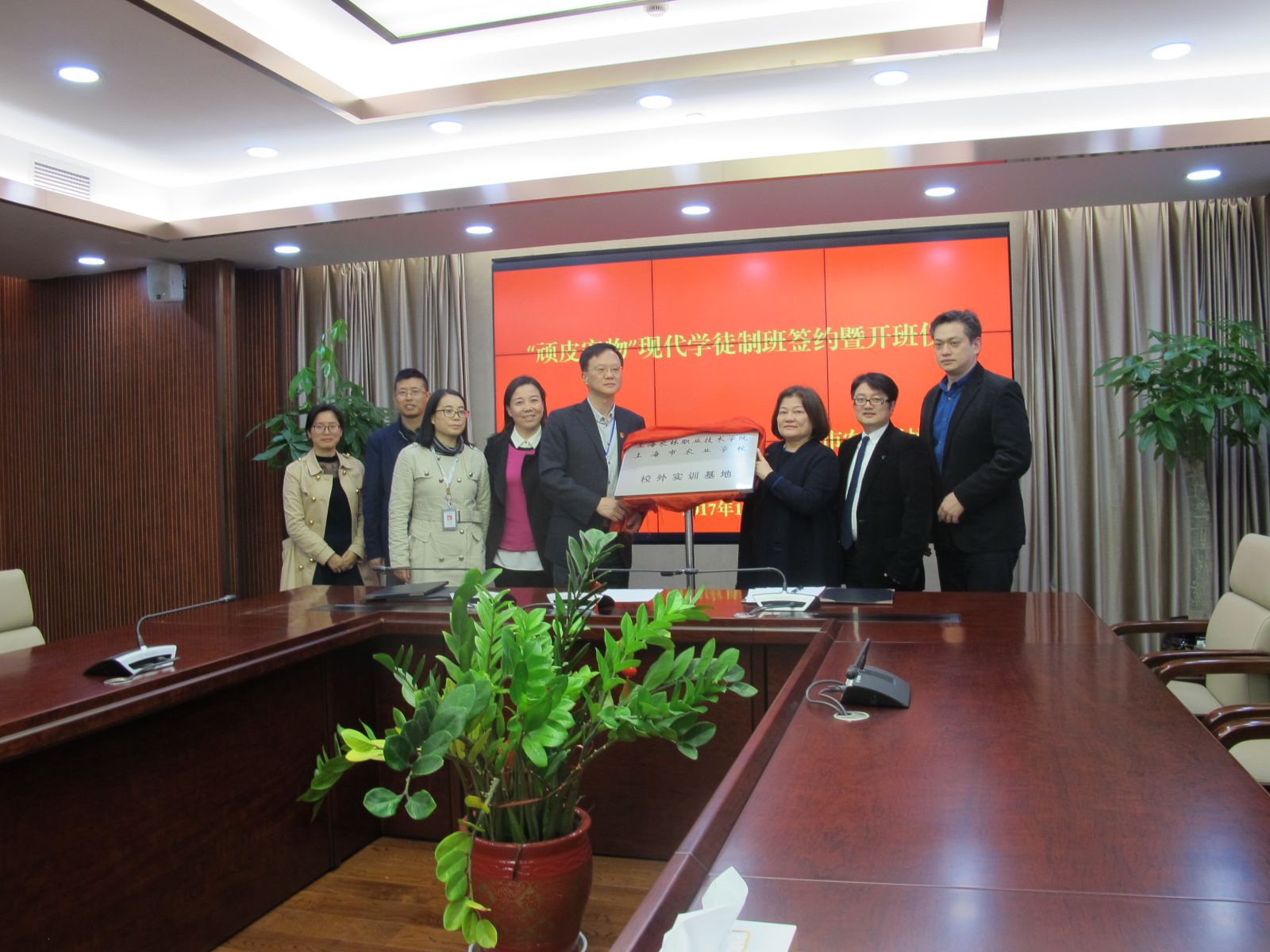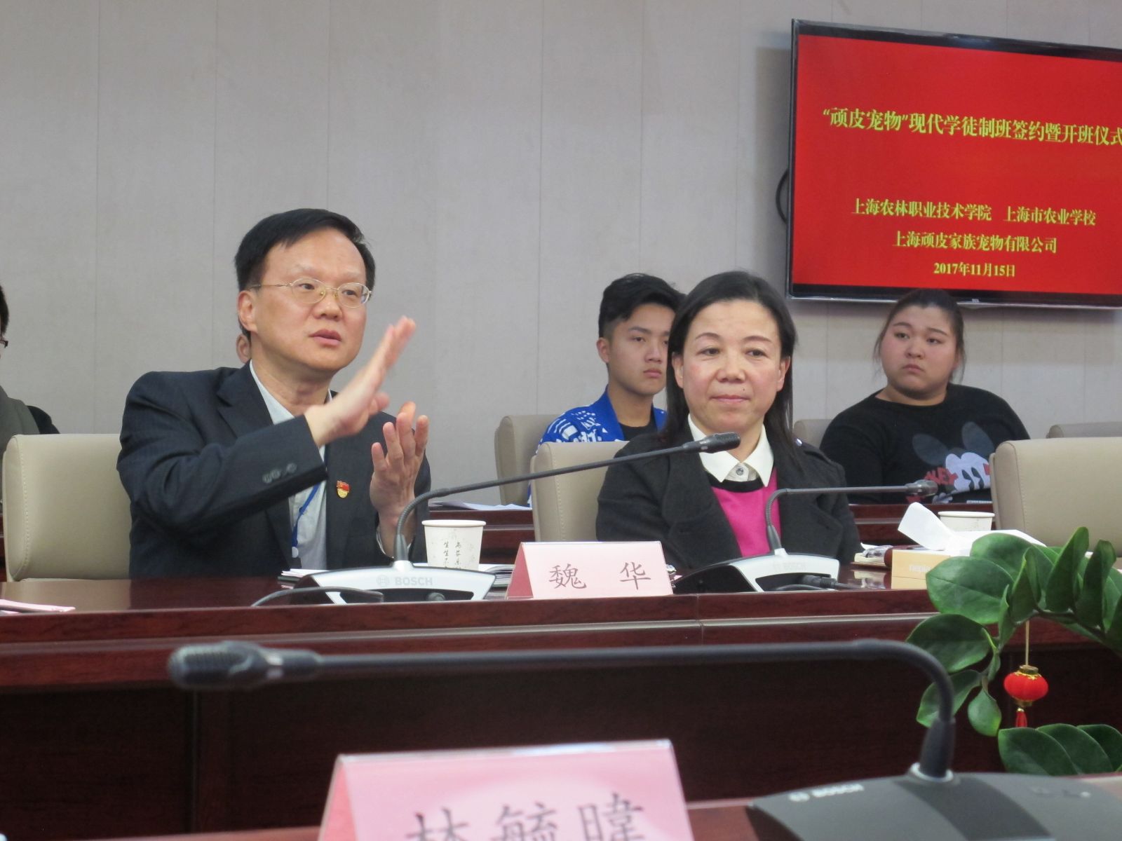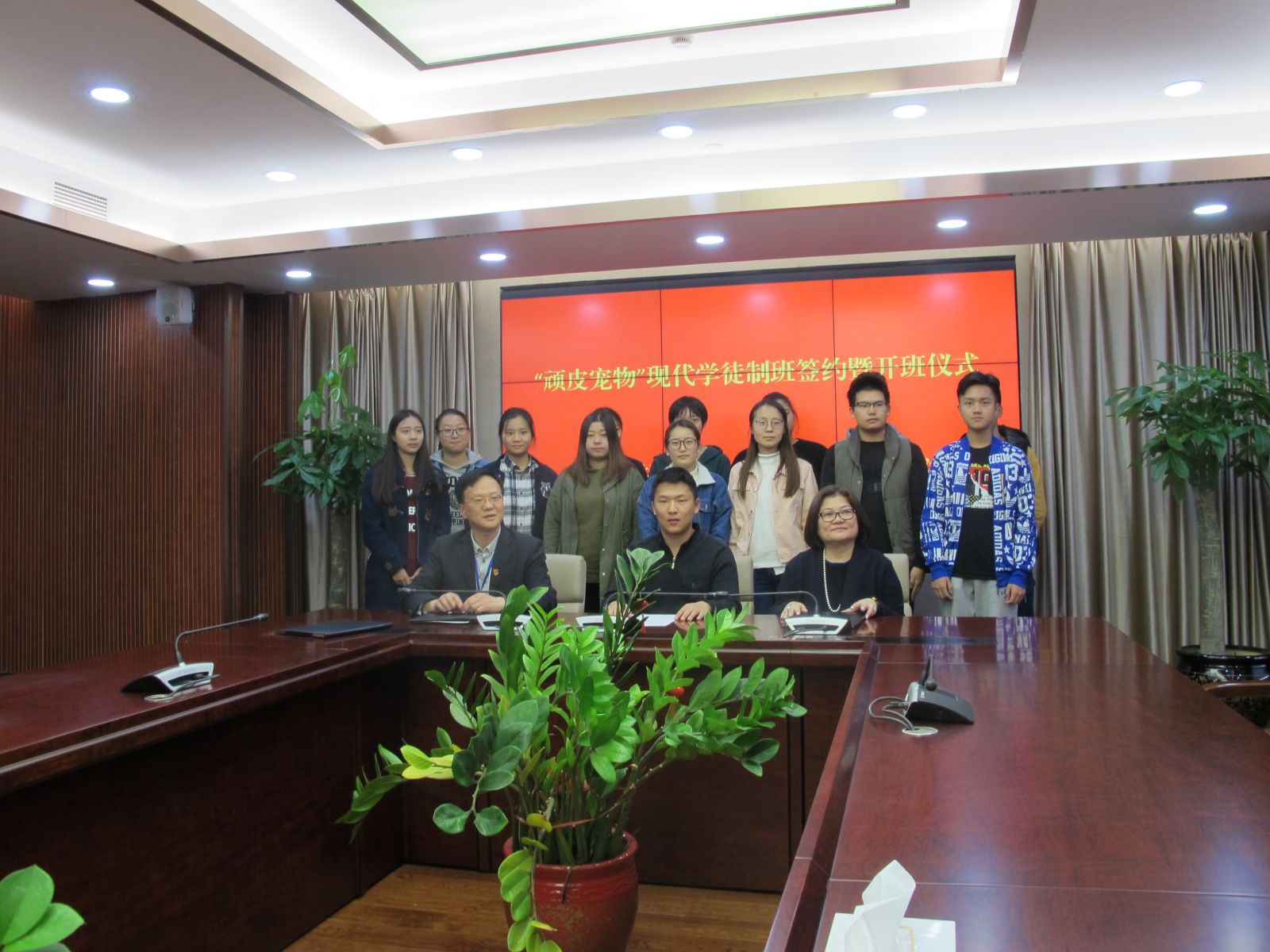 11月15日下午,在学院第一会议室,学院举行”顽皮宠物”现代学徒制试点班签约暨开班仪式。上海顽皮家族宠物有限公司总经理江碧秀,学院院长魏华,企业代表,学院相关部门负责人、教师代表以及“顽皮宠物班”全体学生参加,仪式由校企办负责人宋常英主持。