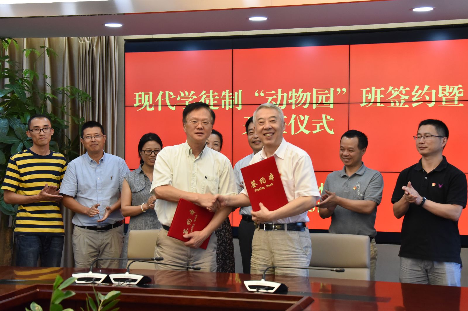 9月5日下午2点,上海农林职业技术学院与上海动物园在学院综合楼第一会议室举行了现代学徒制“动物园”班签约暨开班仪式,并为我校校外实训基地进行了揭牌。 “动物园”班开启了学院入选教育部首批“现代学徒制”试点单位后与本市事业单位联合办班的先河,对学院在开拓校企合作联合办学模式上具有深远的意义。上海动物园党委书记顾玉光、上海农林职业技术学院院长魏华、上海动物园及学院相关部门负责人、部分教师代表及 “动物园”班全体学生参加了开班仪式。仪式由学院副院长谢锦平主持。