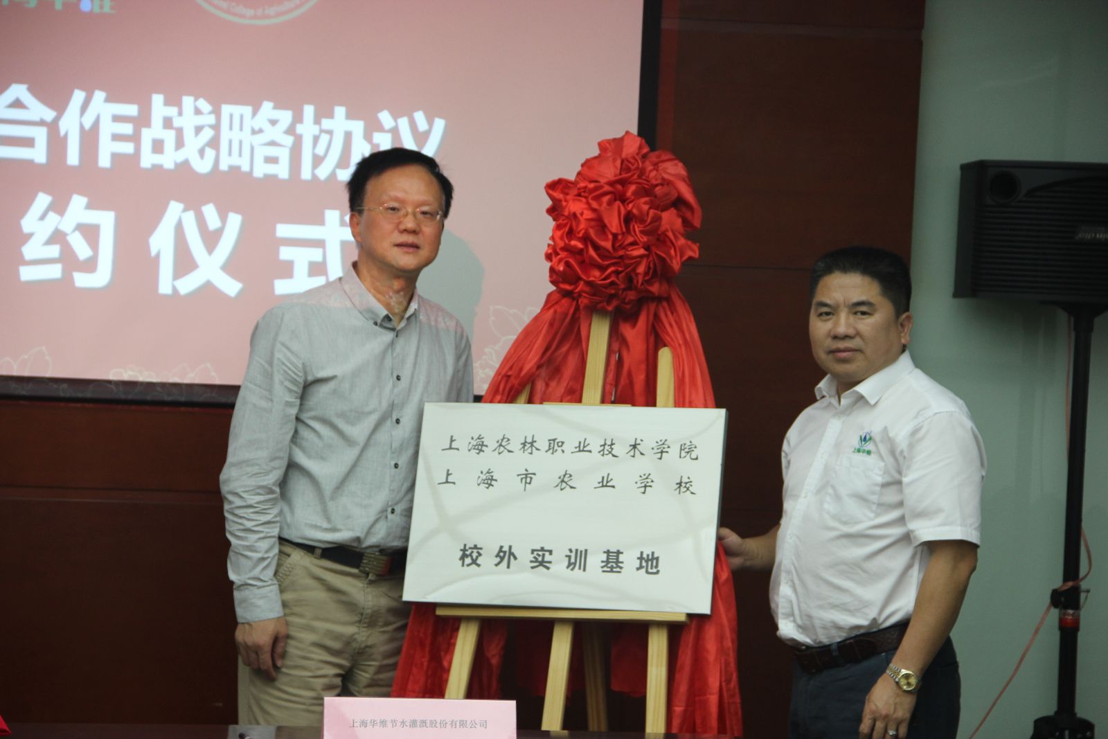 10月9日下午,上海农林职业技术学院与上海华维节水灌溉股份有限公司(以下简称"上海华维公司‘’)在上海华维公司会议室举行了共建校外实训基地签约暨揭牌仪式。上海华维公司董事长吕名礼、上海农林职业技术学院院长魏华、上海华维公司及学院相关部门负责人参加了该仪式。