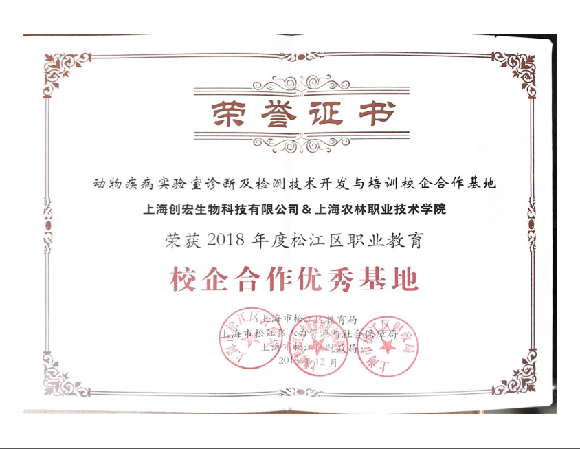 根据《关于2018年度松江区职业教育校企合作基地建设意见》(沪松教〔2018〕13号)文件精神,经松江区教育局、松江区人社局和松江区财政局的联合评选,我校与上海创宏生物科技有限公司合作共建的“动物疾病实验室诊断及检测技术开发与培训校企合作基地”获评2018年度松江区职业教育校企合作优秀基地。