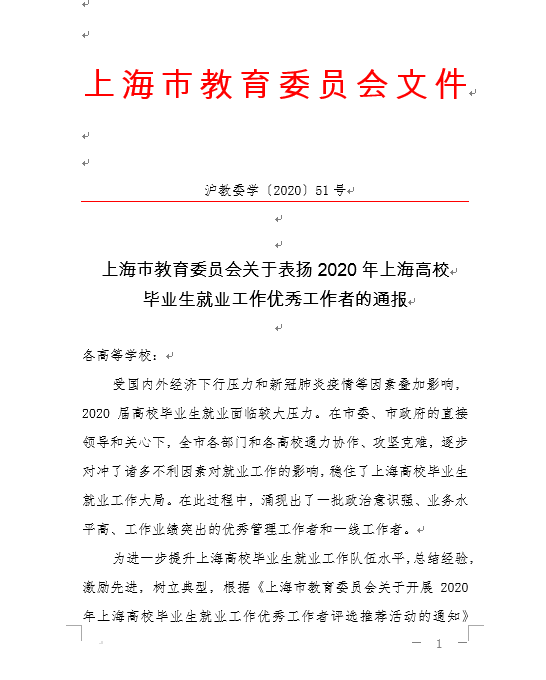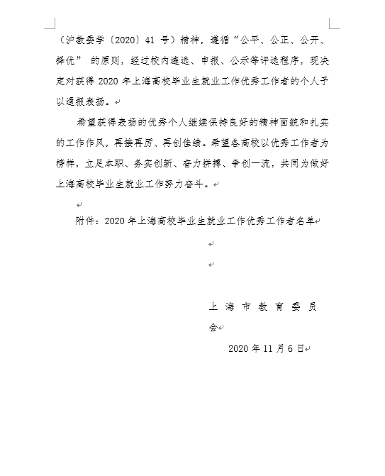 受国内外经济下行压力和新冠肺炎疫情等因素叠加影响,2020届高校毕业生就业面临巨大压力。在市委、市政府的直接领导和关心下,全市各部门和各高校通力协作、攻坚克难,逐步对冲了诸多不利因素对就业工作的影响,稳住了上海高校毕业生就业工作大局。我院2020届毕业就业工作,在全体师生的共同努力下也取得了较好的成绩。学院自收到《上海市教育委员会关于开展2020年上海高校毕业生就业工作优秀工作者评选推荐活动的通知》(沪教委学〔2020〕41号)。依照文件精神,遵循“公平、公正、公开、择优”的原则,结合本年度就业工作开展实际情况,经过校内遴选、申报、公示等评选程序,完成了相关推荐工作。