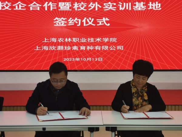 2023年10月13日,上海农林职业技术学院与上海欣灏珍禽育种有限公司在奉贤进行校企合作签约仪式。上海农林职业技术学院副院长张江、上海欣灏珍禽育种有限公司总经理袁红艳及学院相关负责人参加了签约仪式。仪式由校企合作办公室主任刘秀云主持。